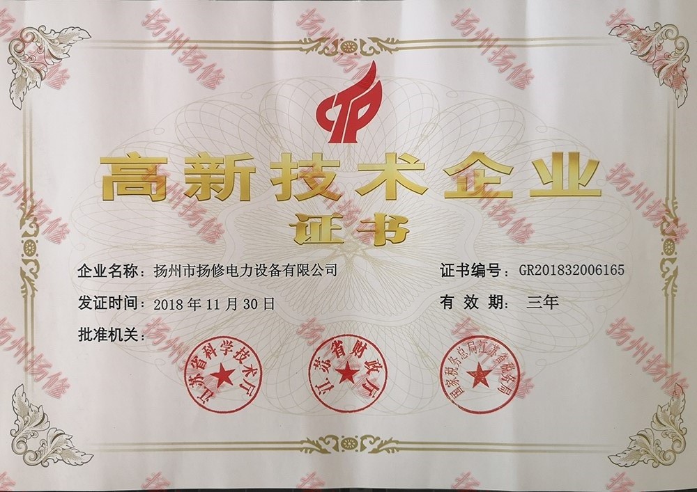 近幾年來,揚州市揚修電力設備有限公司致力于核心技術自主創新,不斷加強研發投入力度,涌現出一大批創新產品及專利技術。為此,經江蘇省科學技術廳、江蘇省財政廳、國家稅務總局江蘇省稅務局審查通過,于2018年11月30日聯合頒發認證證書。